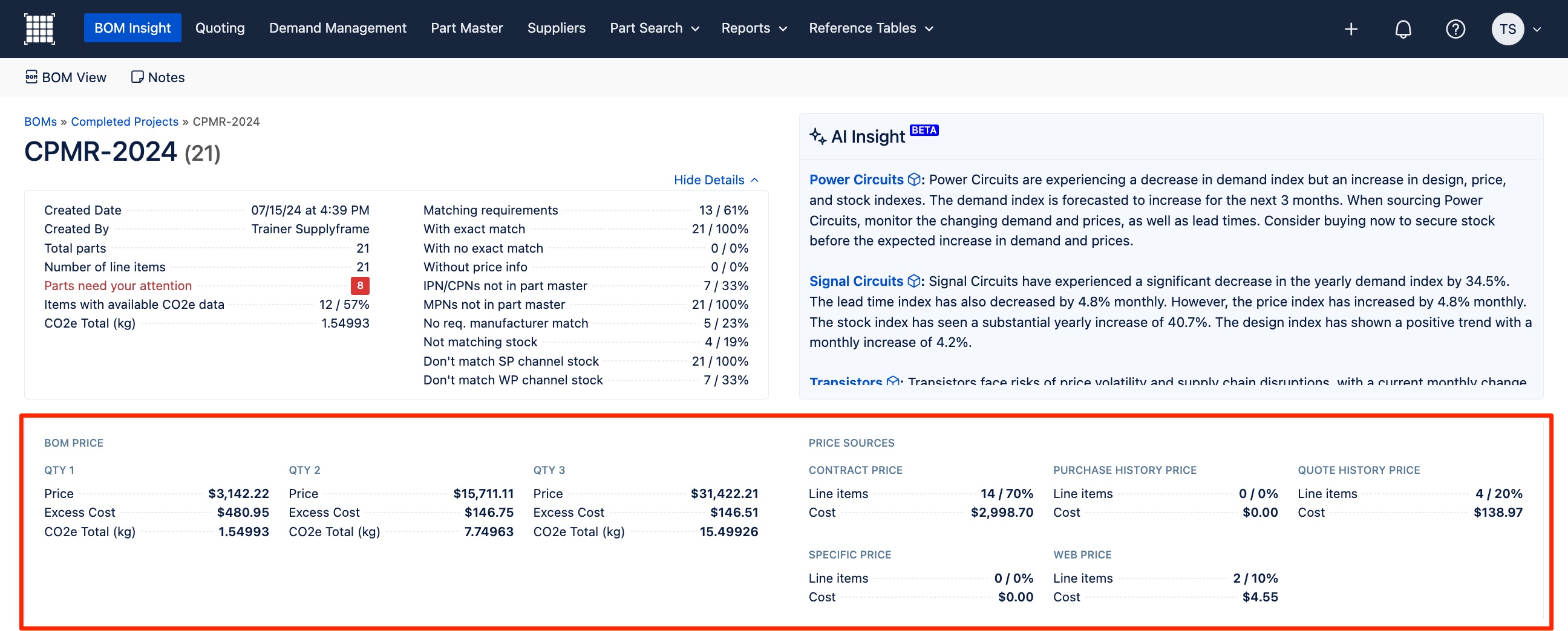 To the top right is the BOM's AI Insight summary, which is only visible with a CIQ module subscription. This feature will take a comprehensive look at the BOM and the different commodities inside the BOM. The AI Insight summarizes up to date market information to extract the essence of what matters most about the commodity trends in the context of strategic sourcing and procurement. This helps you to mitigate potential cost escalations and ensure your projects stay on budget. This can be essential for new product introductions, and keeping you one step ahead of the project planning.