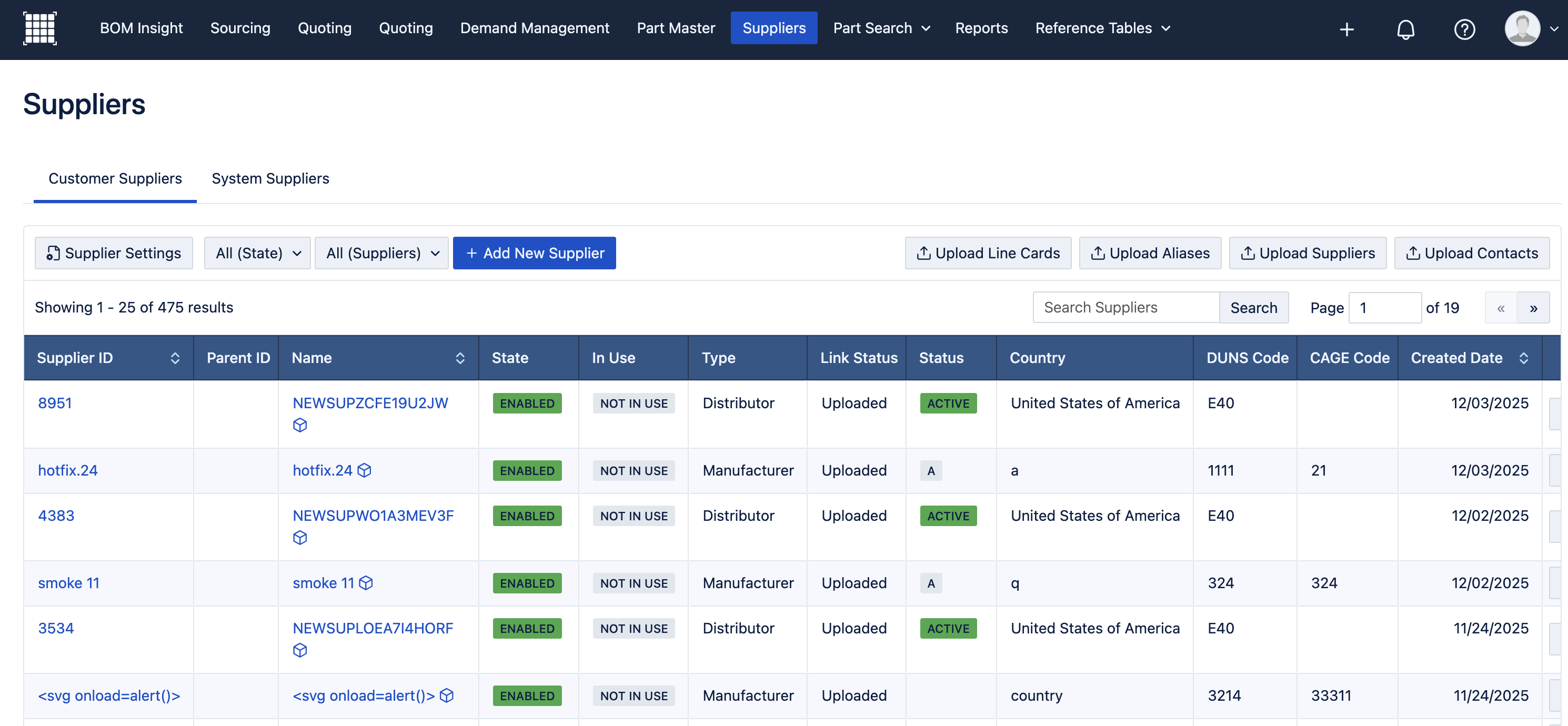 This new supplier will not yet be associated with any of Supplyframe's system suppliers (if available). They will show as a supplier Link Status of “Uploaded” (or created) in your list. For more information about linking your manual suppliers to Supplyframe's system suppliers, please see the help article on Supplier Settings.