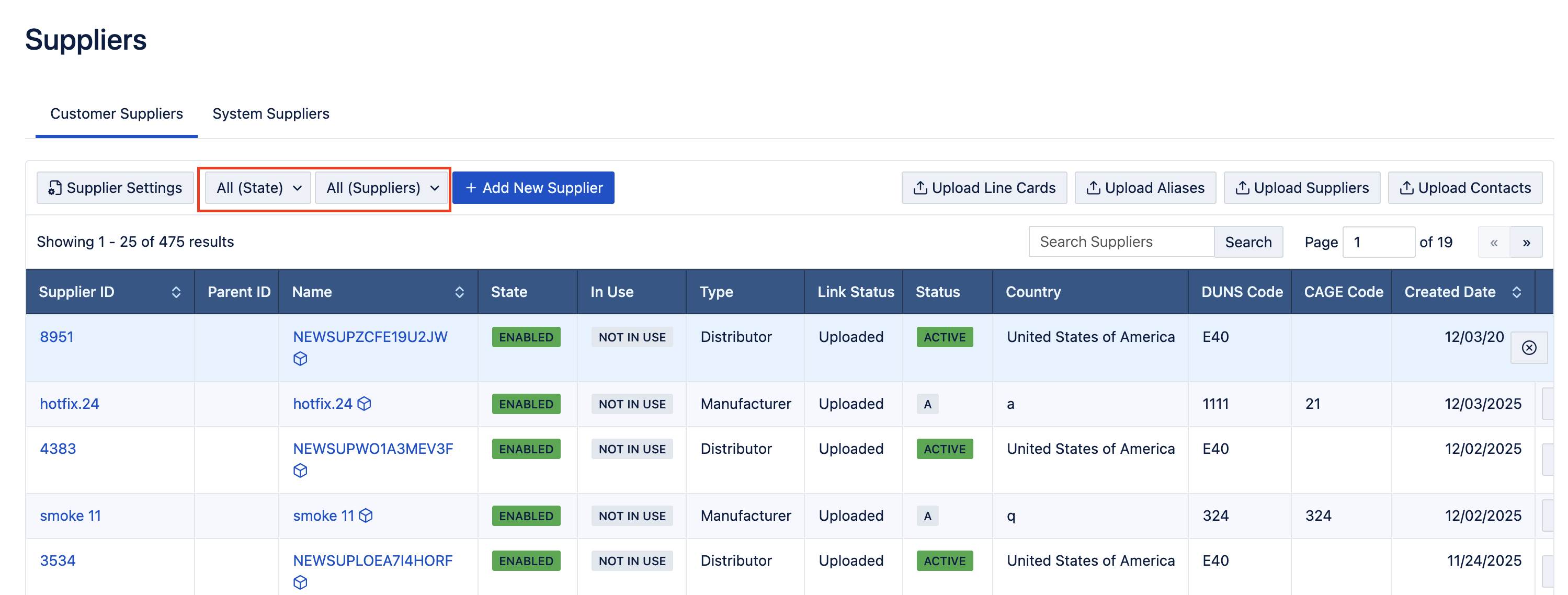 On the Suppliers page you can see all of your account’s suppliers. When needed, you can modify the display to show you only those suppliers who are in a State of "Enabled" or "Disabled".