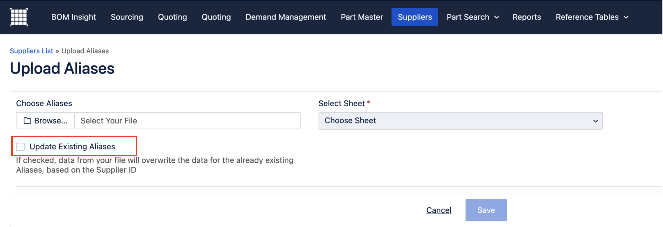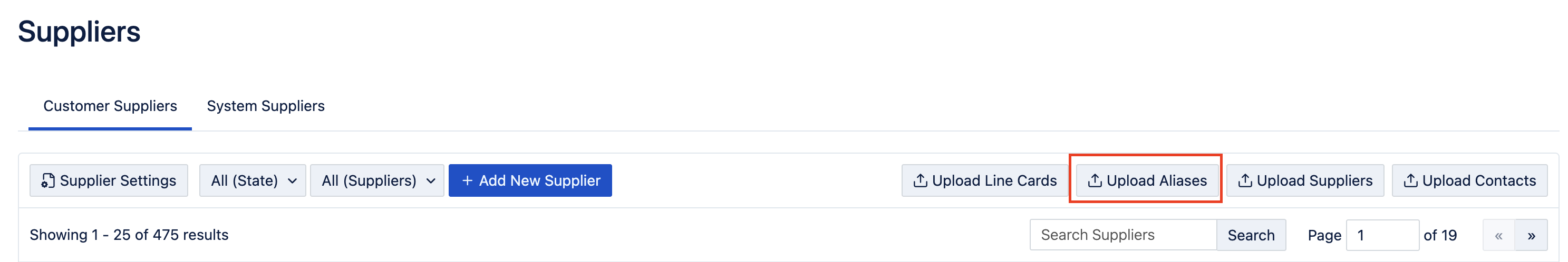 Clicking this 'Upload Aliases' button will navigate you to an upload page where you may browse and import a CSV file containing Supplier ID (required), Alias (required), and State (optional).