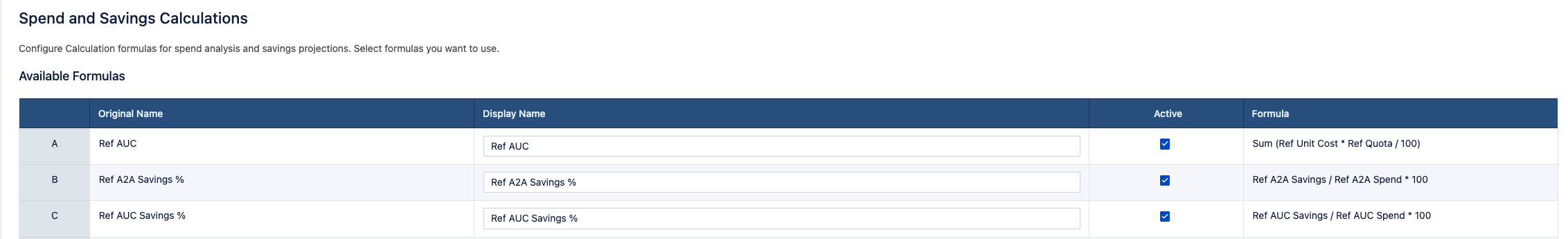 How does it work? - Admins can manually enter in new Displays Names for Spend and Savings Formulas, and can set them as visible via the 'Active' checkbox: