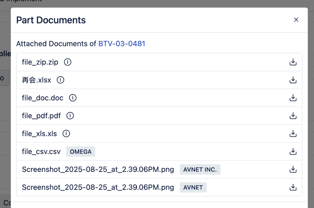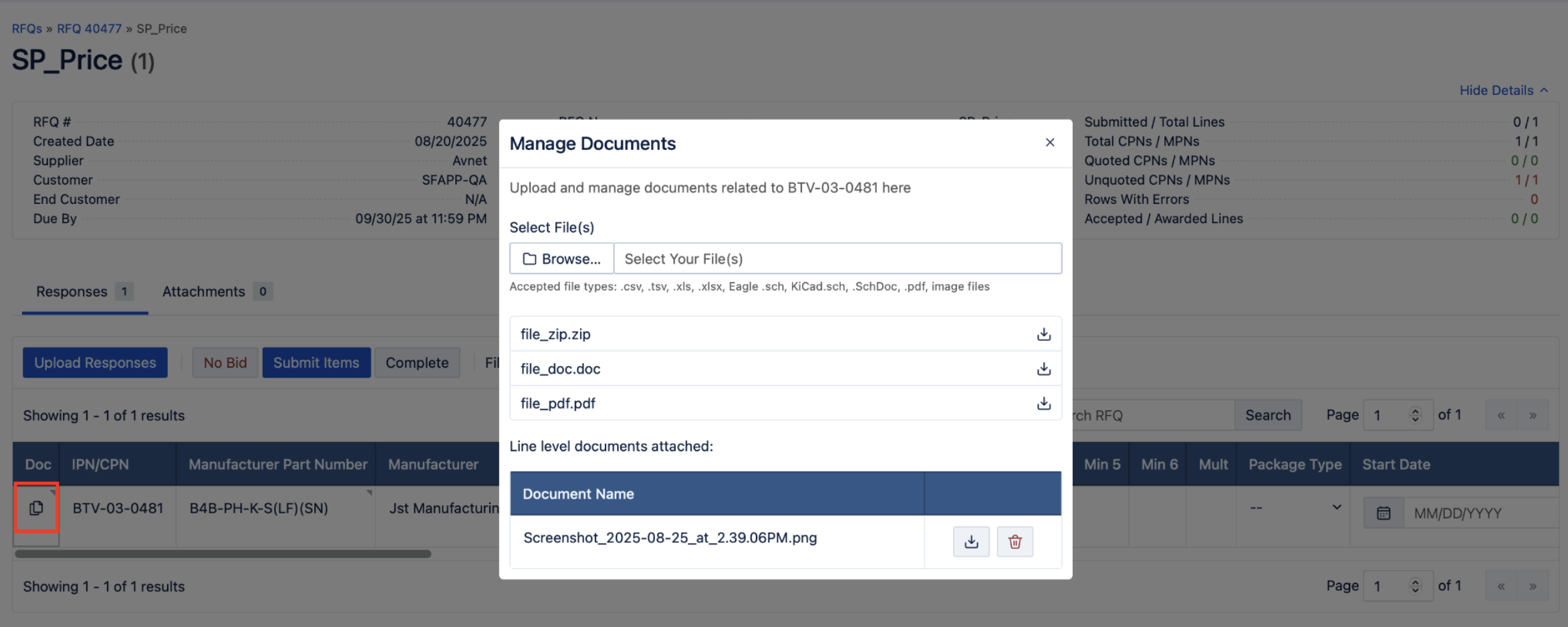How does it work? - Clicking into the Doc icon will allow all suppliers to attach an accepted file type document to that specific line item. For the Buyer side, each document uploaded by your suppliers will be labeled with the Supplier's name.
