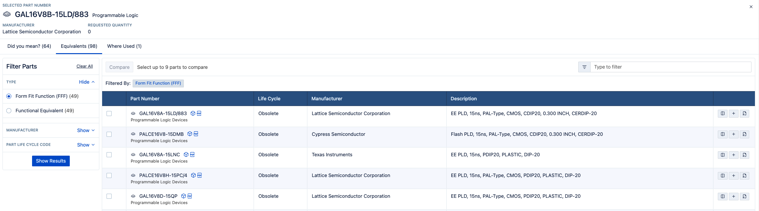 Why do I need this? - Previously, we limited the equivalent results to 100 per part, but that limit has now been removed. In addition to above functionality, more FFFs and Functional Equivalents have become available in the Supplyframe database due to our re-indexing of Accuris data as of August 2025.