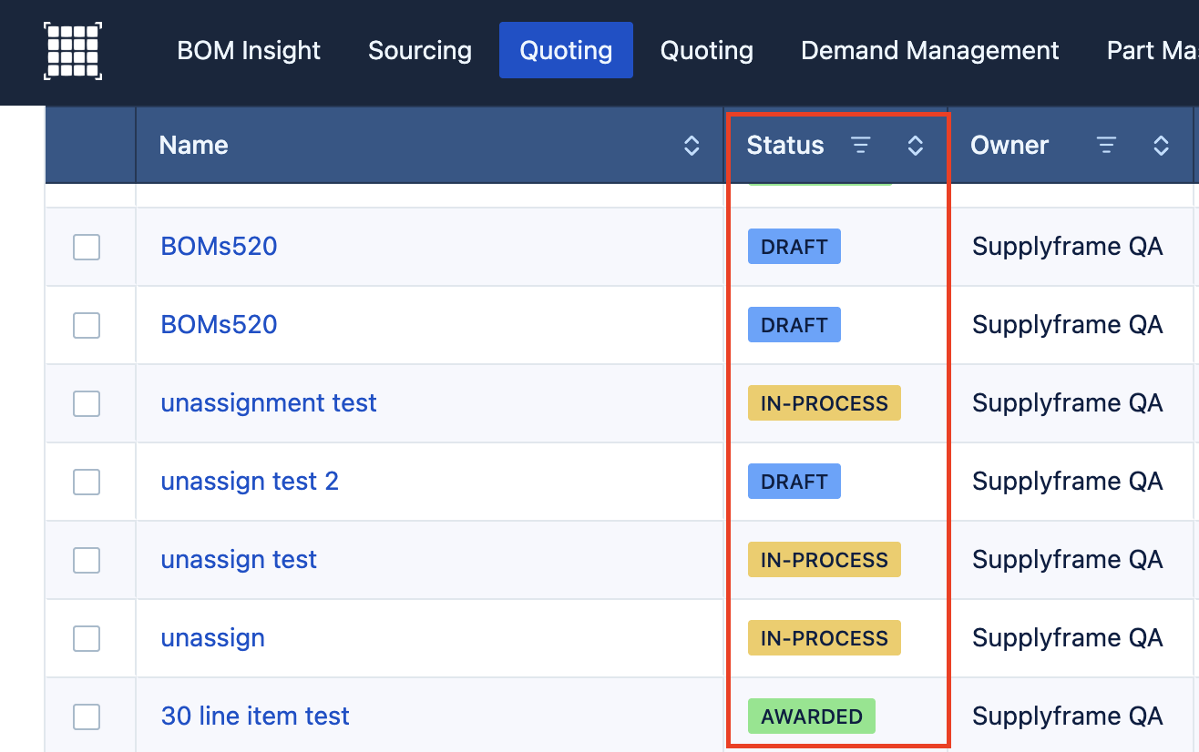As you work through your RFQs, the Status of the RFQ will change. When viewing your main Quoting dashboard, a 'Status' column will show the current state that your team's quotes are in: