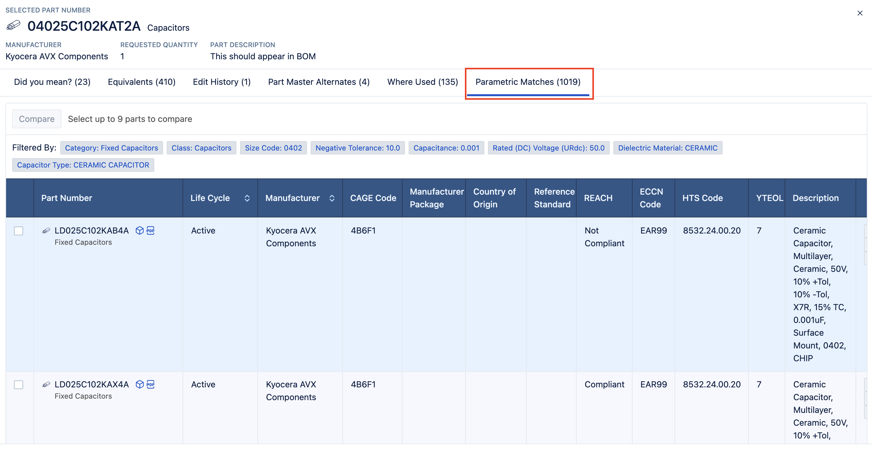 How does it work? - The tab applies pre-set filters are applied that will give the results of all similar parts to the specific MPN. The the tab also provides options to replace, add, or compare parts directly.