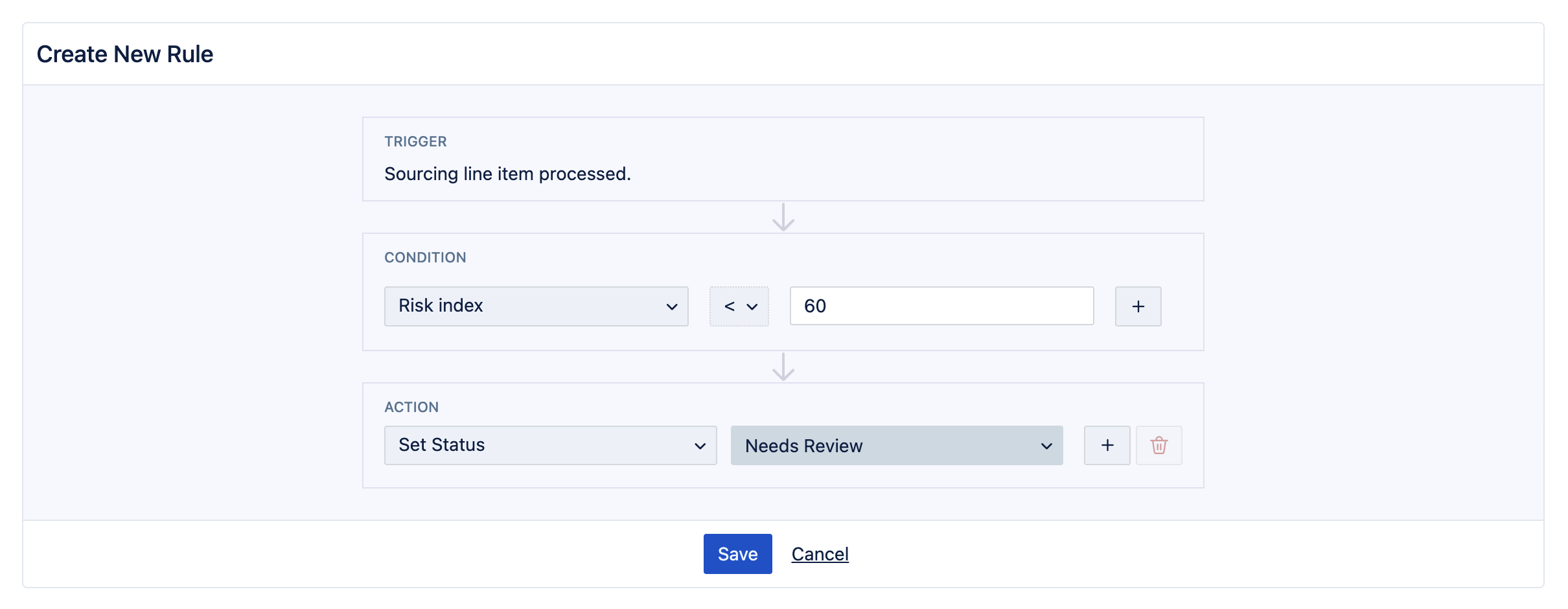 In this example, we are creating a rule where if Risk Index is over 60, the system will automatically set the line item in Sourcing to the 'Needs Review' status.