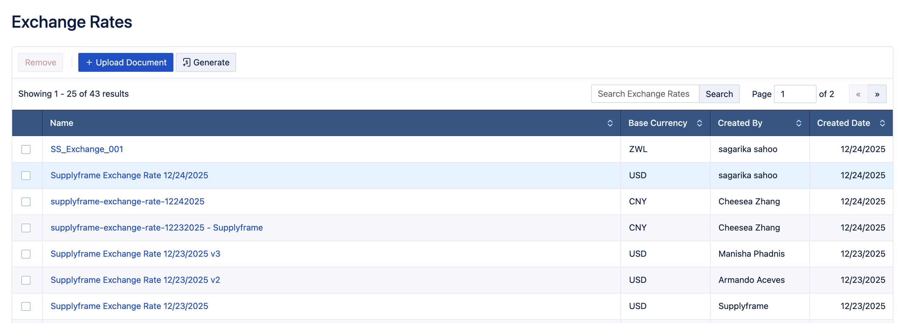 How does it work? - Once you've navigated to 'Exchange Rates', you'll see a list of your existing Exchange Rates, and options to Upload a new exchange rate, and Generate new rates, based on Supplyframe's existing Currency data.