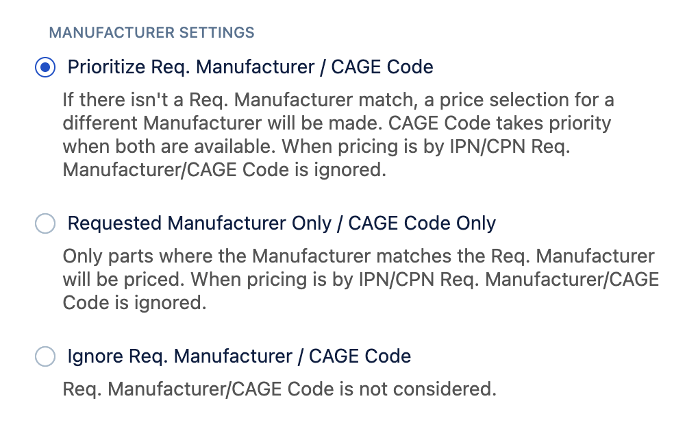 In your BOM Manufacturer Settings, you'll be able to choose between Prioritizing Requested Manufacturer and CAGE code, Enforce it when selecting a price from sources where the same MPN may exist under different manufacturers, or ignore these fields entirely.