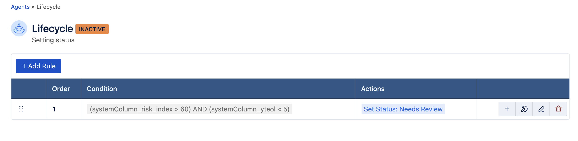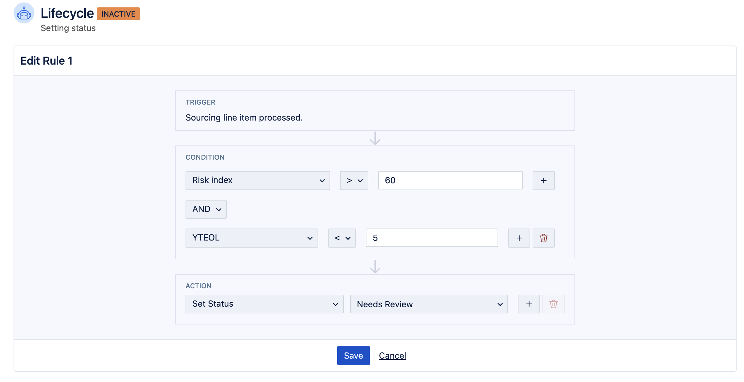 In this example rule, we have set a condition that when a line item's Risk Index is greater than 60, and its YTEOL is less than 5, the action will set the line item 'Status' to 'Needs Review':