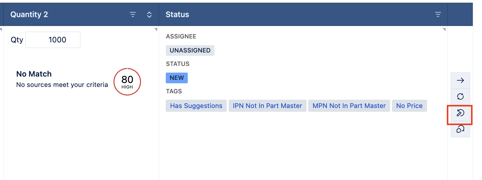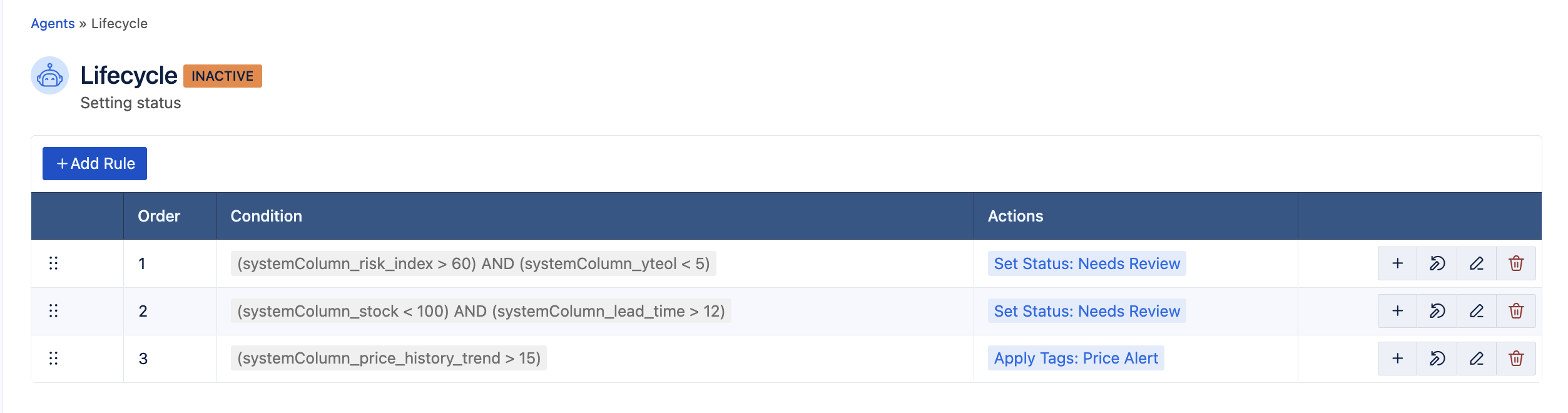 In this example, we've expanded the previous rule with a second rule to also set status as 'Needs Review' when Stock is less than 100, and Lead Time is greater than 12 weeks, and a third rule that applies a custom tag of 'Price Alert' if the Price History Trend % is less than 15%:
