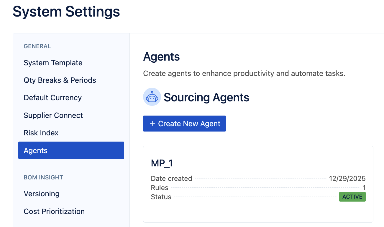 To create an Agent, an Admin will need to create a Rule, first navigating to 'System Settings', clicking 'Agents' in the side Panel, and then clicking 'Create New Agent' :