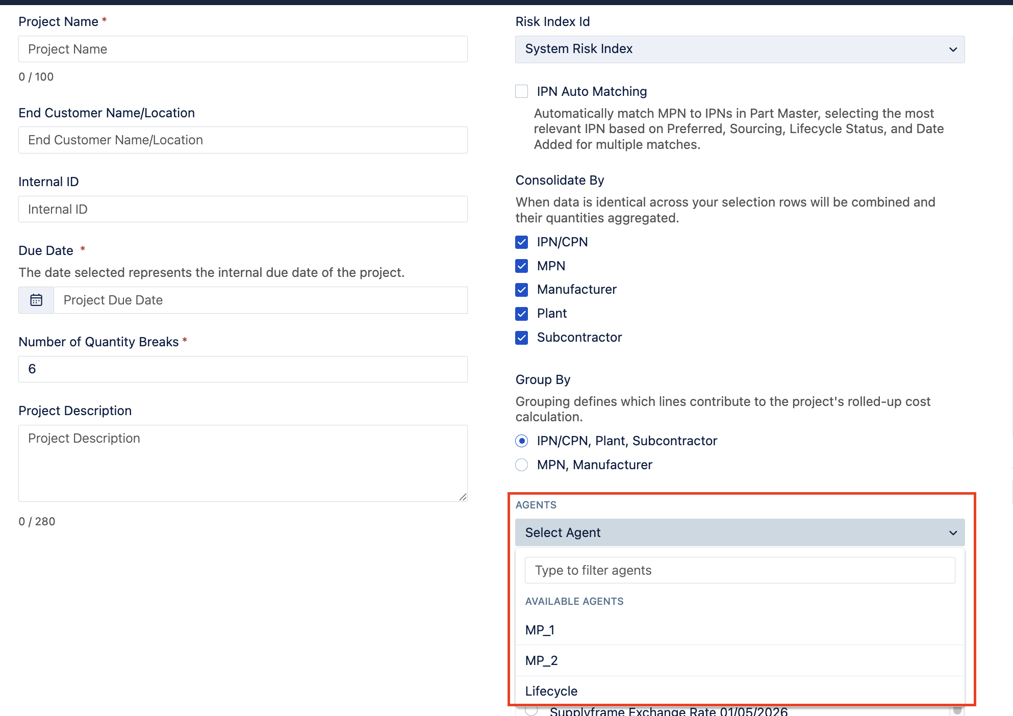 For all users, when creating a new Sourcing project, a user can select the agent they wish to use by clicking 'Select Agent':