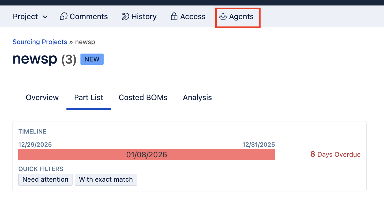 For existing projects, you can select 'Agents' at the top of your Sourcing Project: