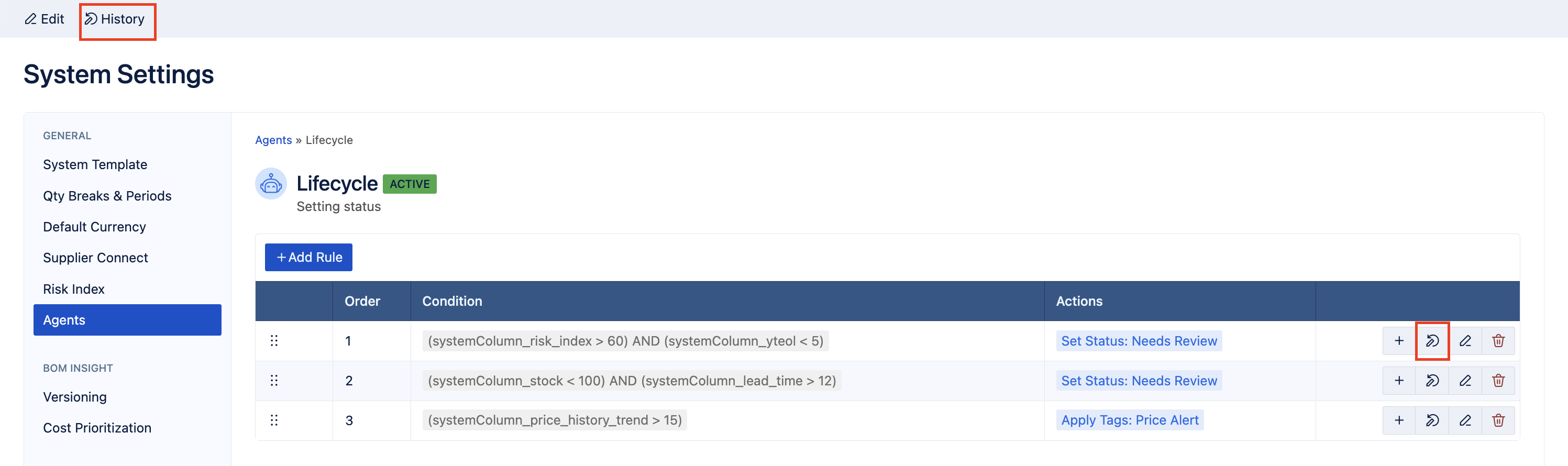 An Admin can view top-level History for an entire agent by clicking 'History' seen in the top-left of a specific agent, or individual Rule history by clicking the Pen icon found in the line item of a rule:
