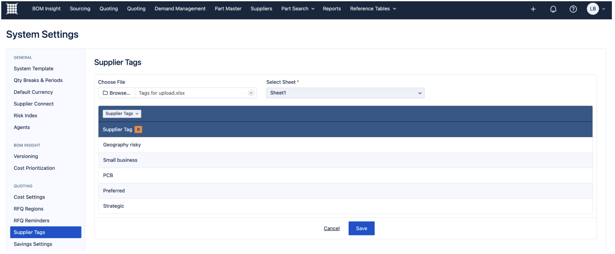 Where can I find it? - As an admin, you'll be able to do your bulk upload via System Settings, and then in the 'Suppliers Tags' page: